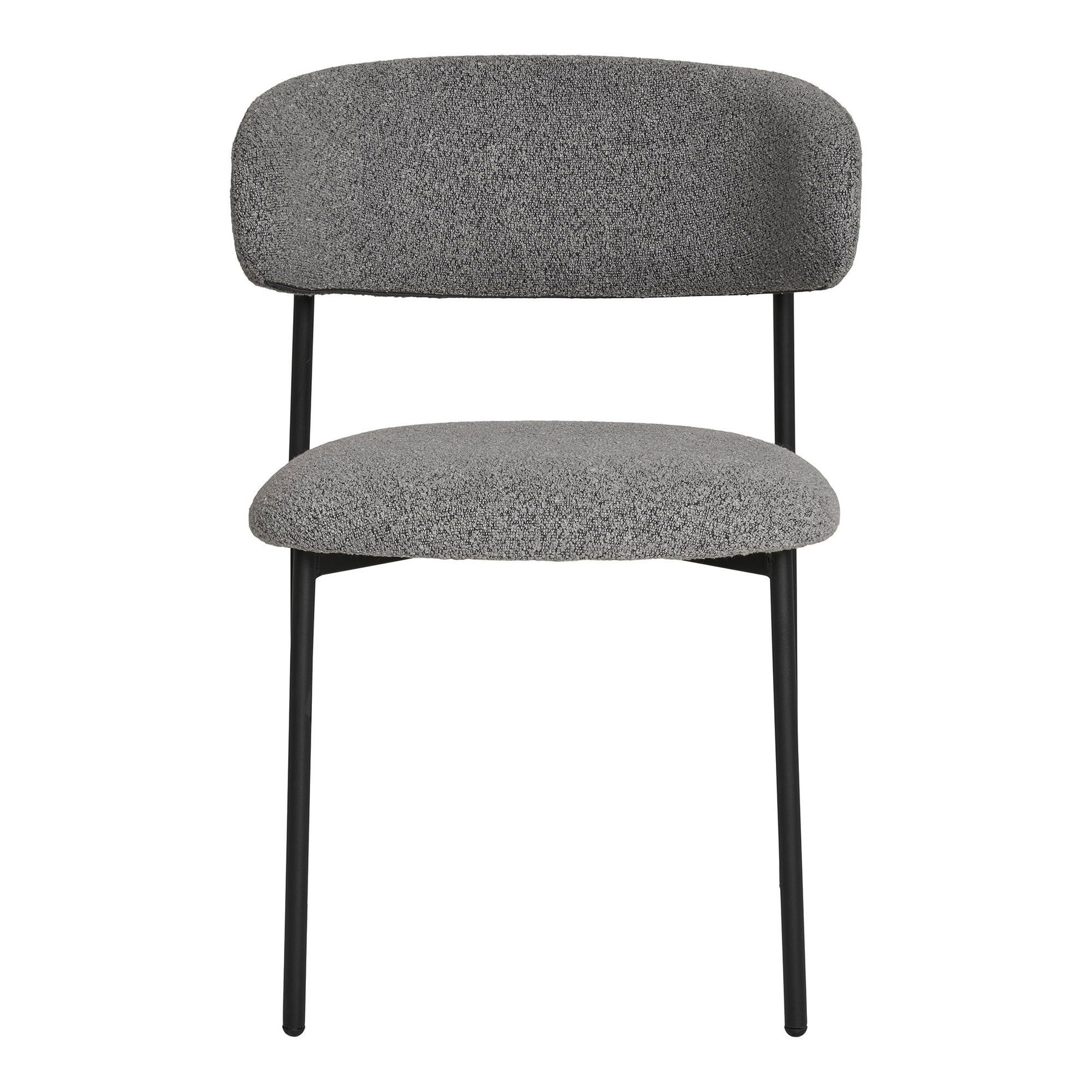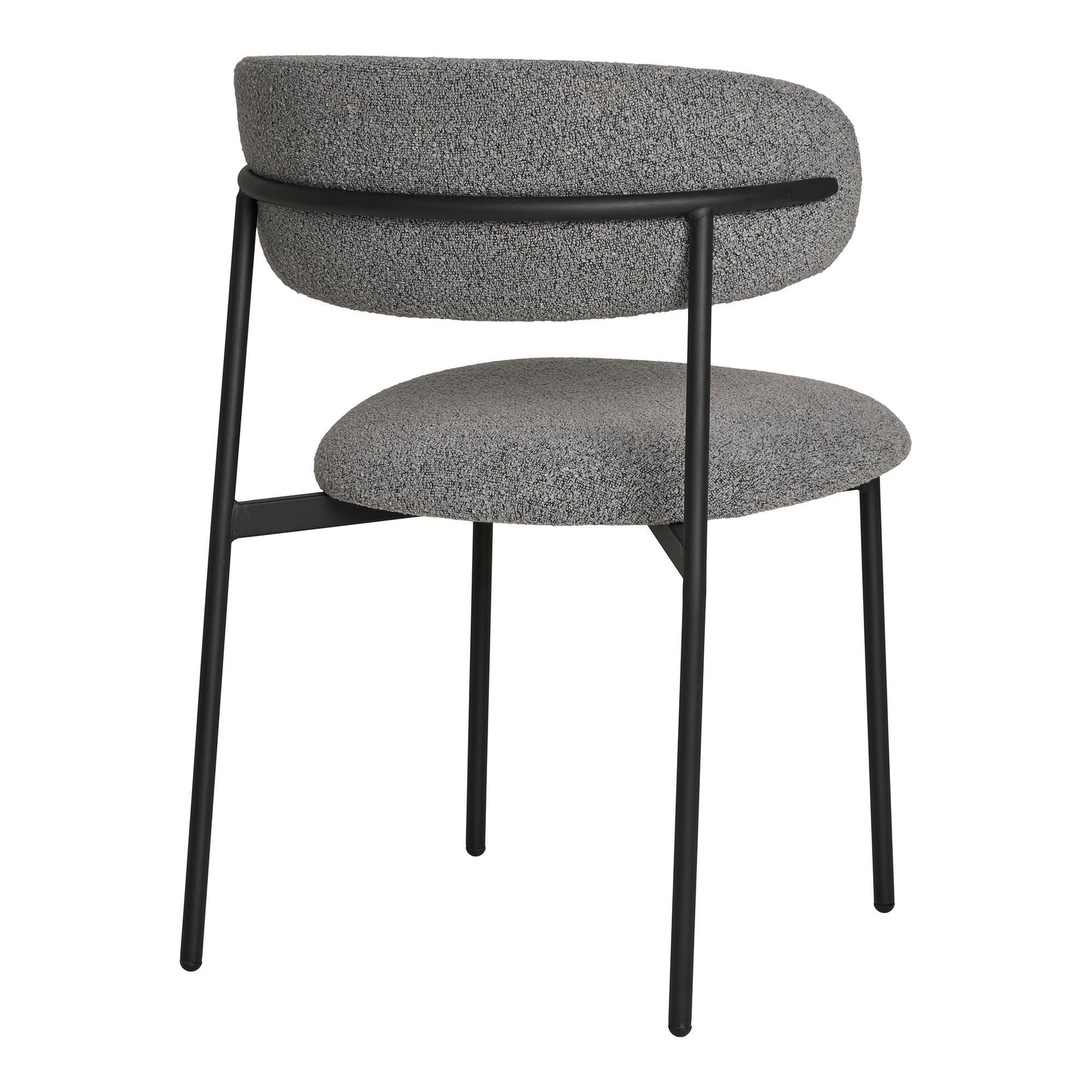 Met zijn zachte bouclé bekleding in lichtgrijs en zijn stevige zwarte metalen poten is deze stoel een perfecte balans tussen modern design en warme, huiselijke charme. De Mira eetkamerstoel is ontworpen om iedere eetruimte te verrijken met stijl en comfort.