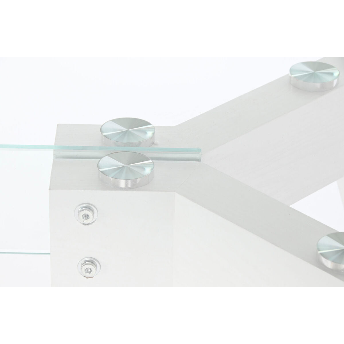 De tafel is vervaardigd uit een hoogwaardige combinatie van transparant kristalglas en hout MDF, afgewerkt in helder wit.