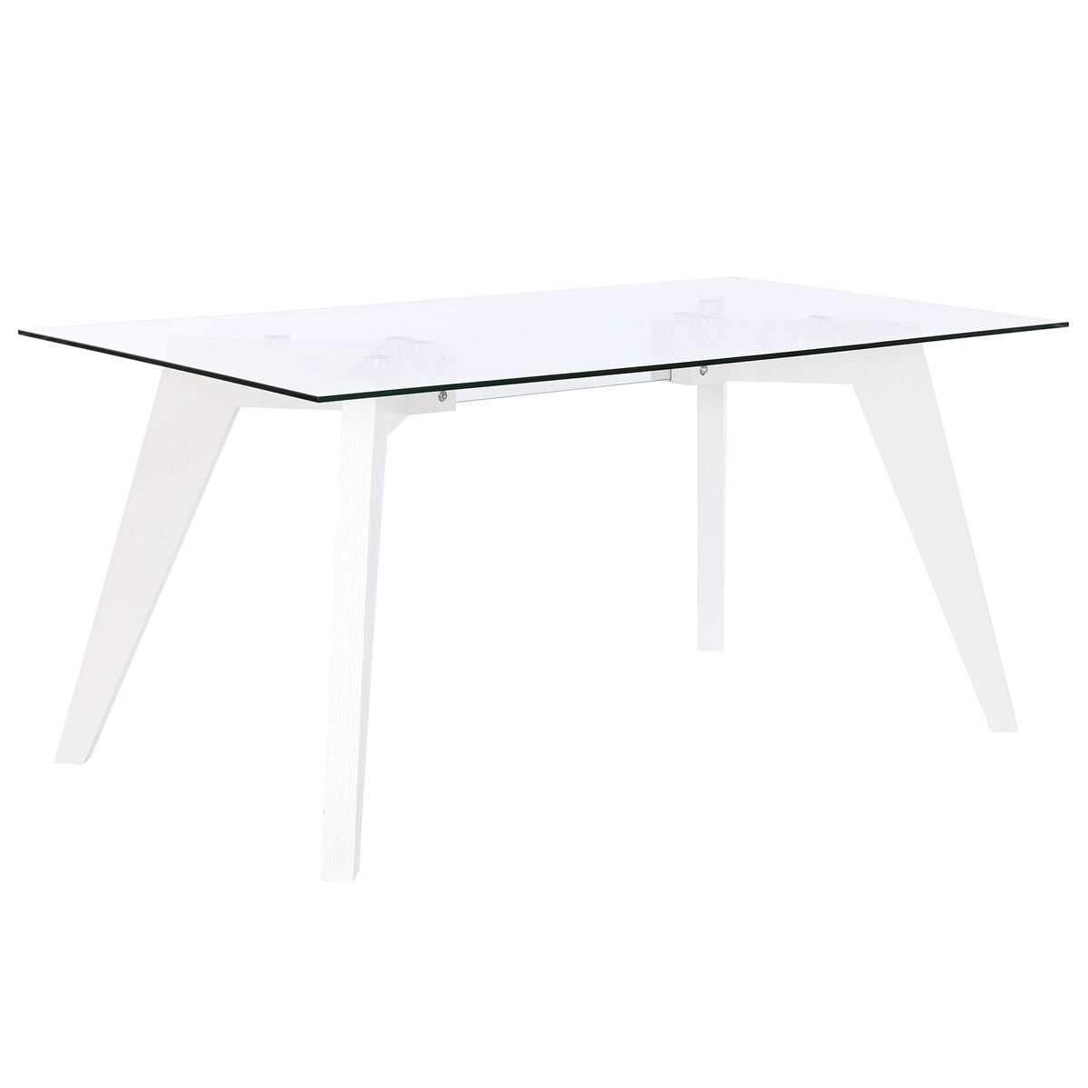 Met zijn stijlvolle mix van wit hout, MDF en transparant kristalglas is dit meubelstuk een echte blikvanger in iedere eetruimte. De tafel straalt verfijning, lichtheid en eigentijdse elegantie uit, en vormt het perfecte middelpunt voor gezellige diners en stijlvolle interieurs.