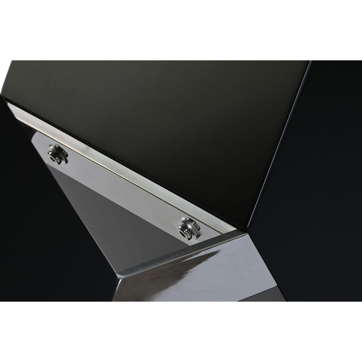 Het ontwerp is strak, maar toch warm dankzij de natuurlijke houtstructuren van het MDF, subtiel zichtbaar onder de zwarte afwerking. De glazen bovenkant geeft het geheel een luchtige look en laat het licht prachtig reflecteren in je eetruimte. Ideaal voor zowel dagelijkse diners als feestelijke avonden.